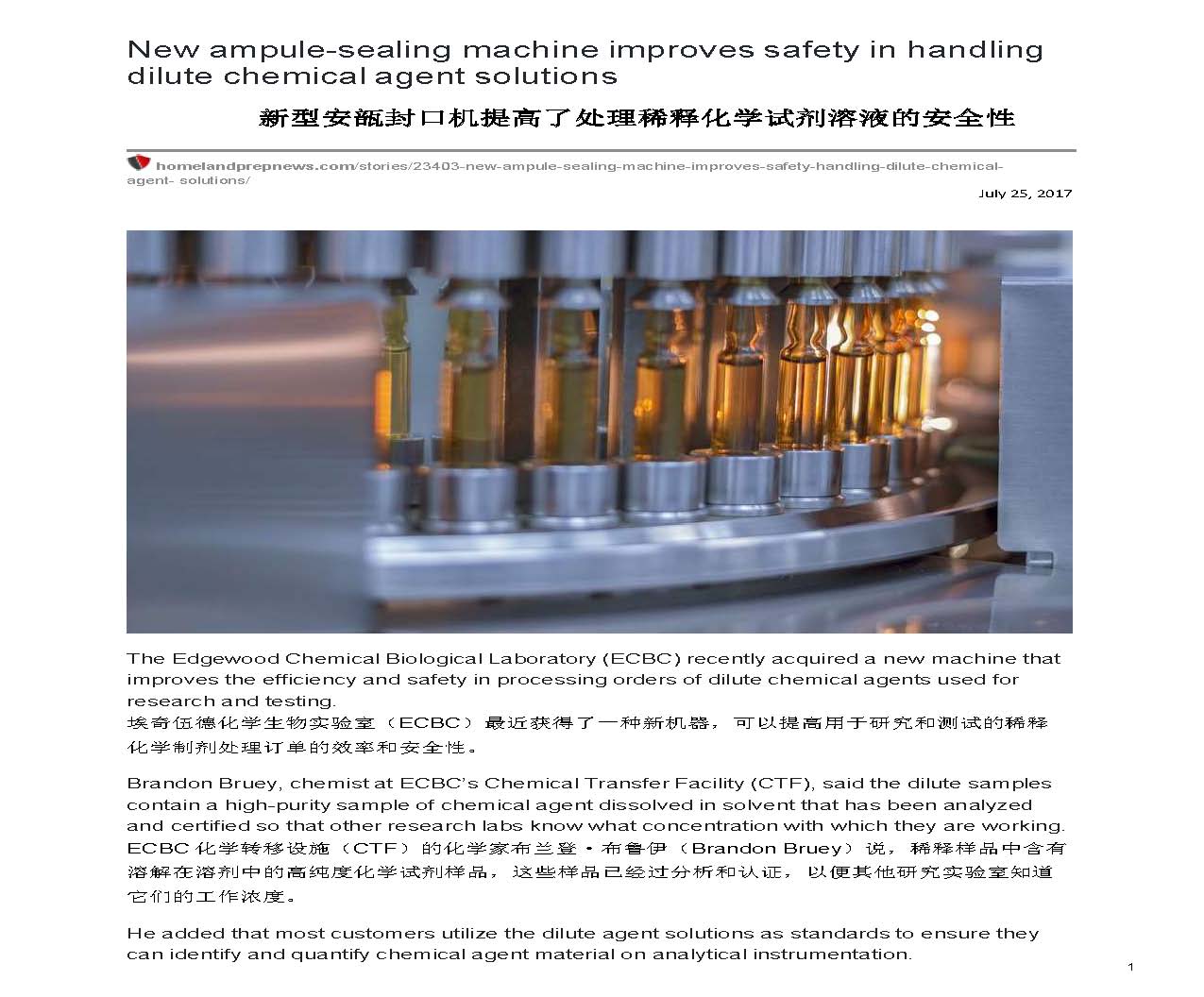 The Edgewood Chemical Biological Laboratory (ECBC) recently acquired a new machine that improves the efficiency and safety in processing orders of dilute chemical agents used for research and testing.
