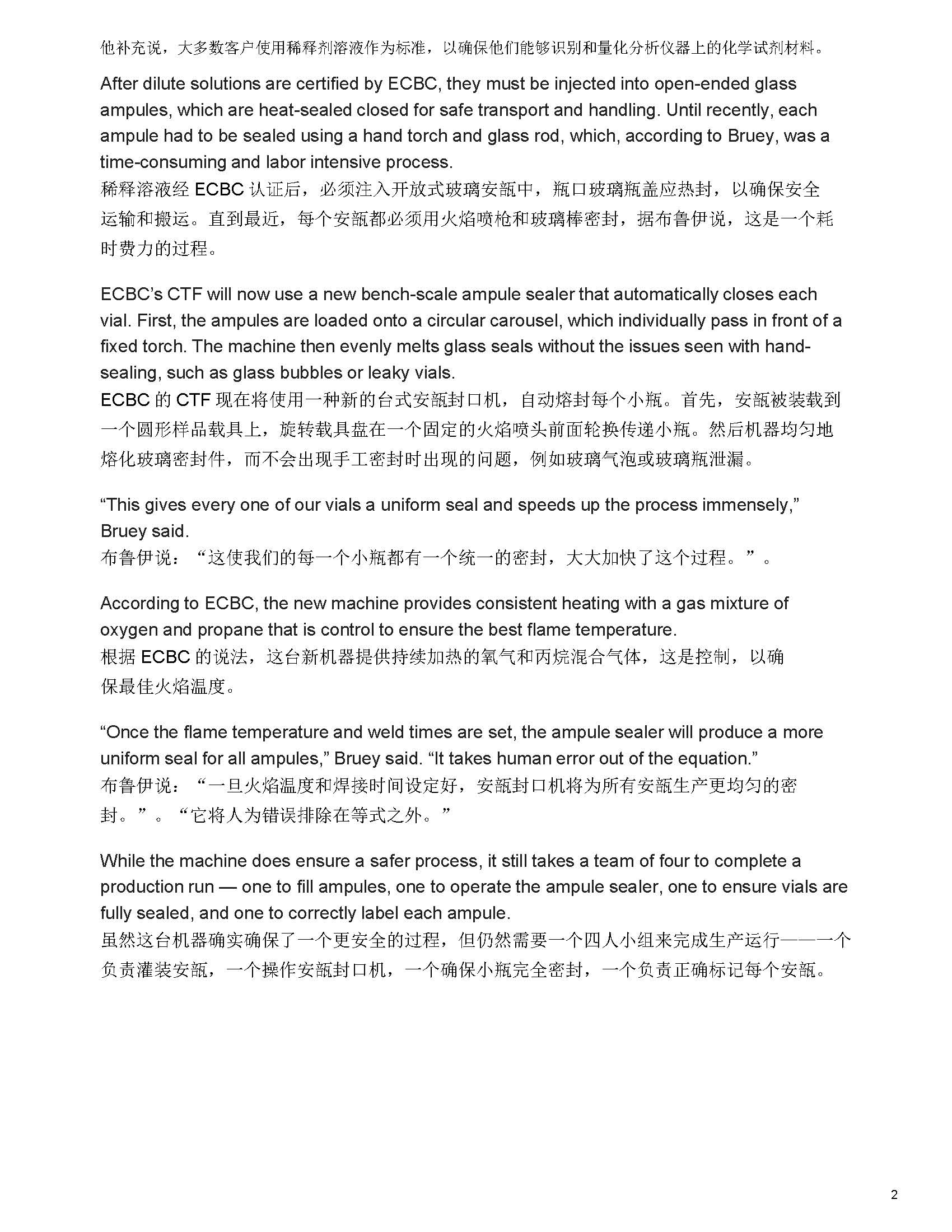 稀释溶液经ECBC认证后,必须注入开放式玻璃安瓿中,瓶口玻璃瓶盖应热封,以确保安全运输和搬运。直到最近,每个安瓿都必须用火焰喷枪和玻璃棒密封,据布鲁伊说,这是一个耗时费力的过程。