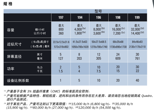 Comil ® 底驱型产品有四个型号,产量可从几盎司(几克)拓展至35,000 磅/小时(15,900 公斤/小时)。